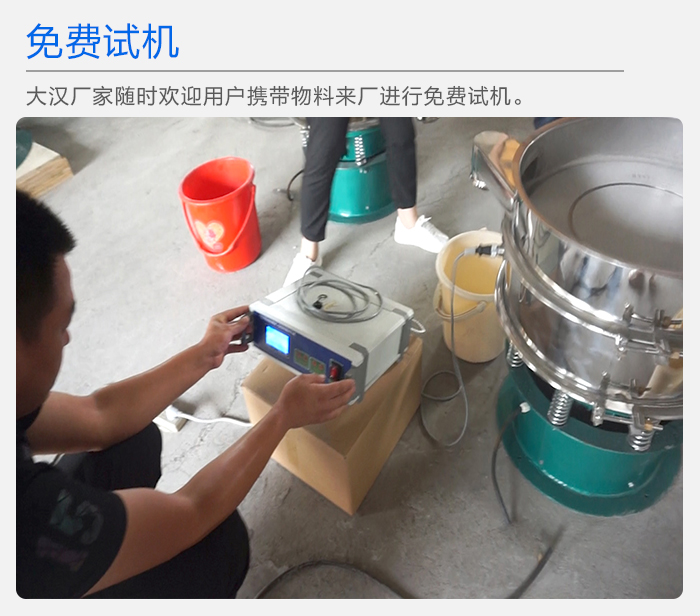 如果您想了解超聲波振動(dòng)篩的工作狀況,大漢廠家隨時(shí)歡迎用戶攜帶物料來(lái)廠進(jìn)行免費(fèi)試機(jī)。
