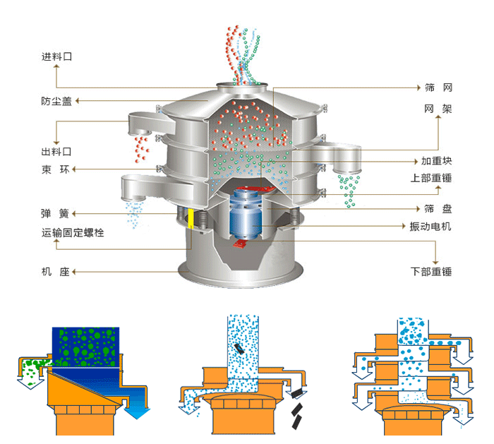 小型不銹鋼振動篩是由直立式振動電機作為激振源,電機上、下兩端安裝有偏心重錘,將電機的旋轉運動轉變為水平、垂直、傾斜的三次元運動,再把這個運動傳遞給篩面進行篩分。調節上、下兩端的相位角,可以改變物料在篩面上的運動軌跡。